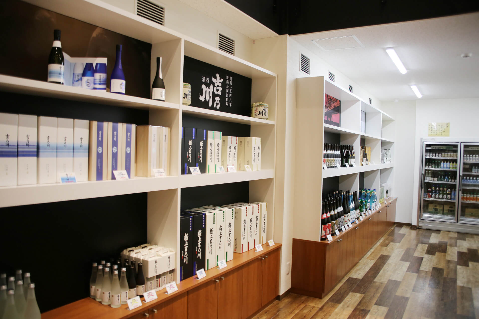 売店吉乃川の定番のお酒はもちろん、季節限定酒や、醸蔵限定販売のお酒も。