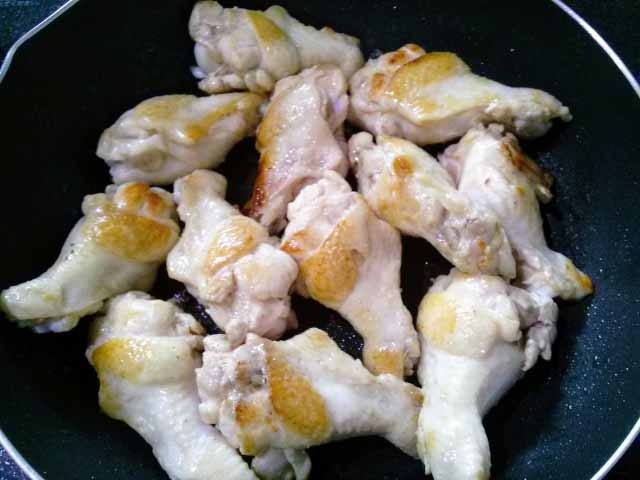 1、熱したフライパンにオリーブオイルを入れ、クミンシードを香り付けをし手羽元に焼き目をつけます。