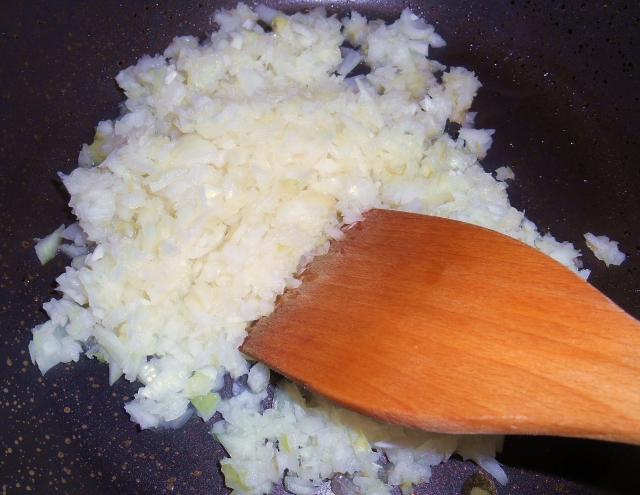 2、みじん切りをした玉ねぎをアメ色になるまで炒めます。