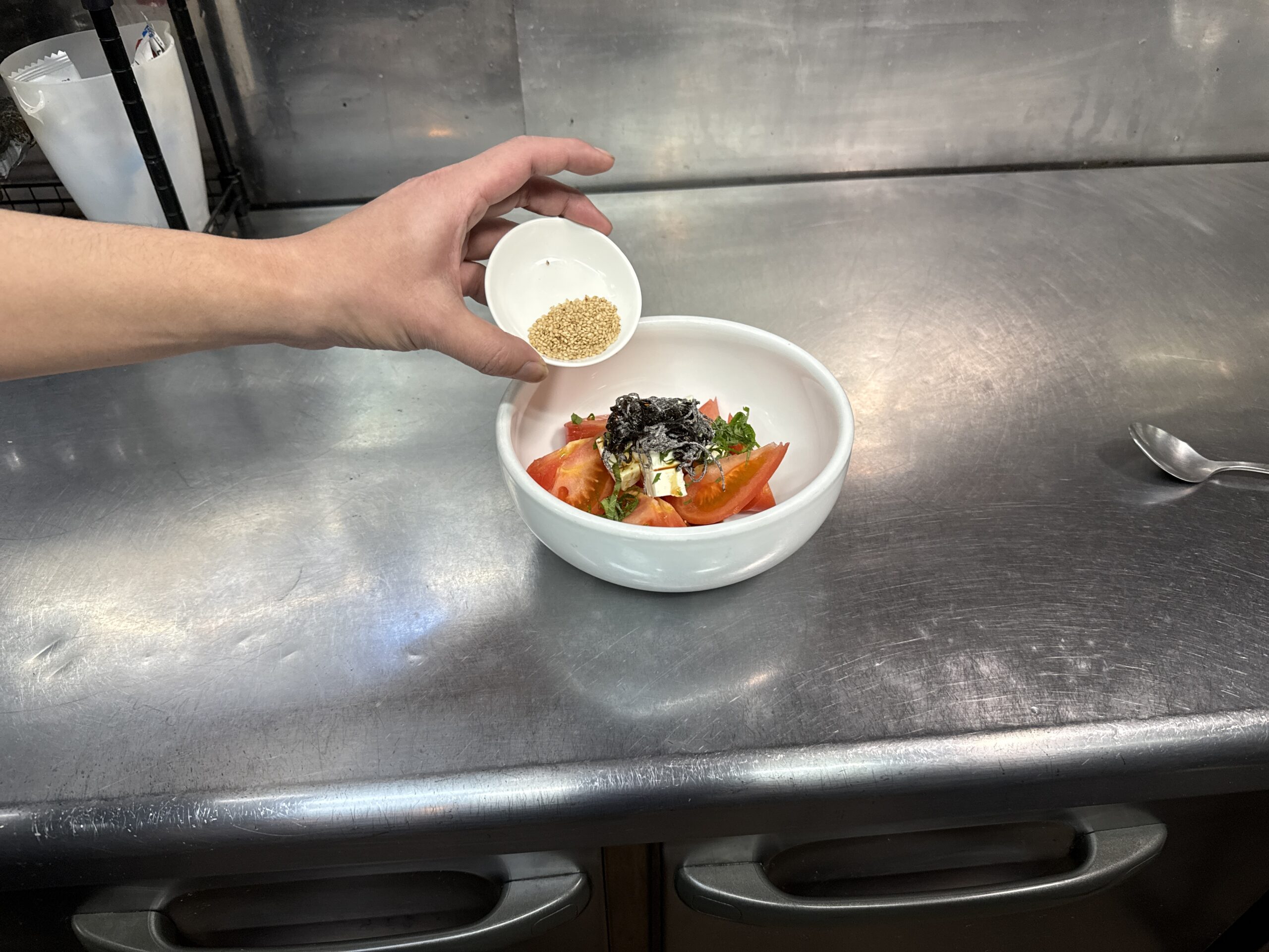 今回は特別栽培米 五百万石 純米吟醸 無濾過原酒<しぼりたて>に合う料理ということで「トマトとクリームチーズの塩昆布和え」を作っていただきました。仕事から帰ってもすぐに作れるスピード料理になっています。これからのクリスマスパーティーの一品としてもオススメ!放送終了後には、お店でも提供いたしますので、ぜひお酒と一緒にお楽しみください。
